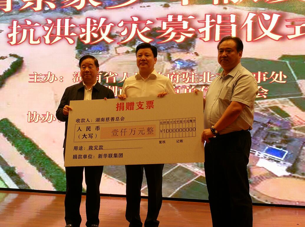 7月6日,新華聯(lián)集團(tuán)向湖南災(zāi)區(qū)緊急捐款1100萬(wàn)元,其中集團(tuán)捐款1000萬(wàn)元,集團(tuán)董事局主席兼總裁傅軍以個(gè)人名義捐款100萬(wàn)元,用于湖南抗洪救災(zāi)。捐贈(zèng)儀式在北京湖南大廈舉行。
