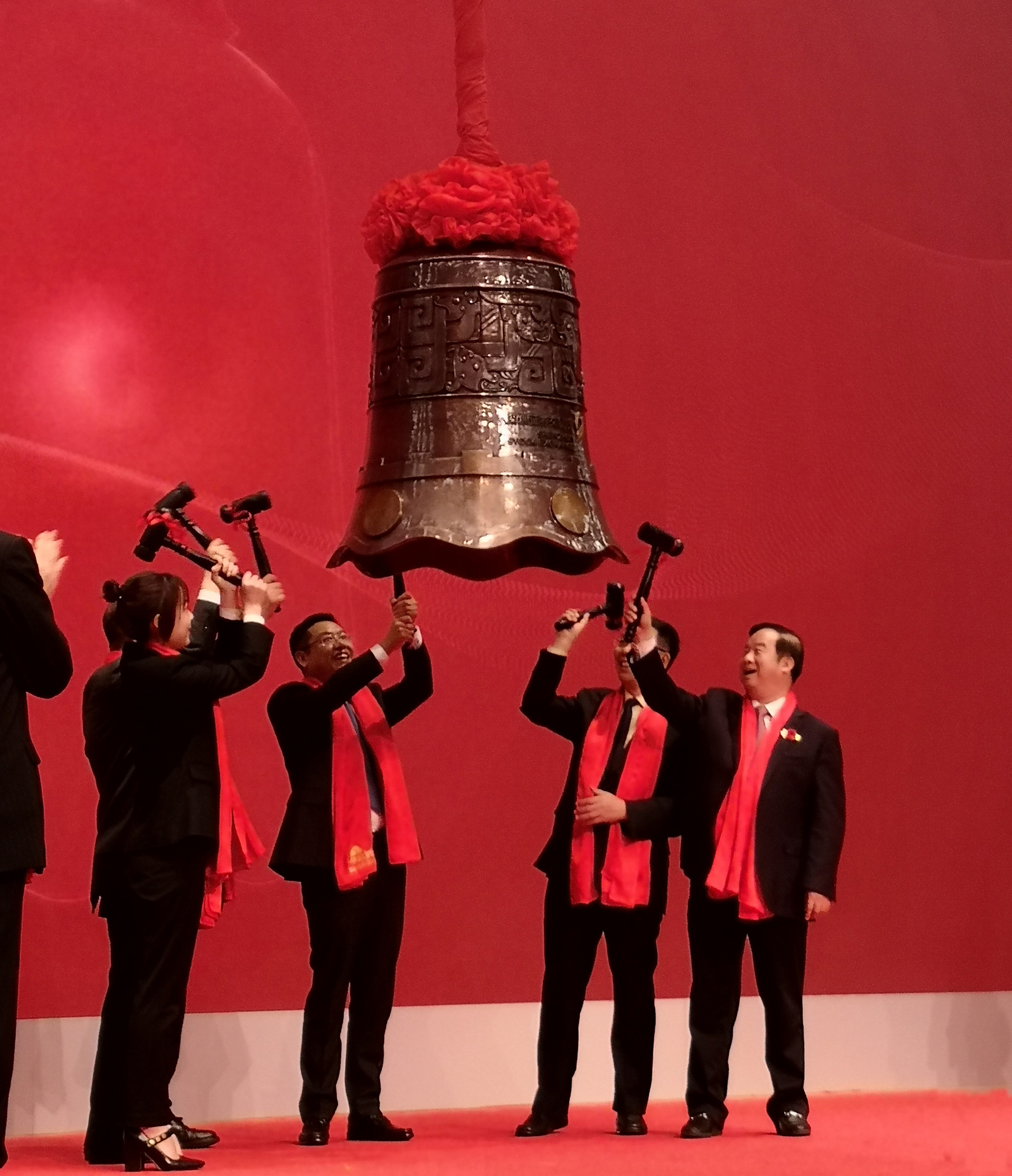 華致酒行董事長吳向東、茅臺集團董事長李保芳、五糧液股份董事長劉中國、中國食品工業協會黨委書記馬勇等與華致酒行董監事、高級管理人員,股東代表、供貨商、重點客戶、員工代表、中介機構及媒體朋友共同出席了上市儀式,見證這一歷史時刻。新華聯集團董事局主席兼總裁傅軍應邀出席儀式并一同敲響了上市鐘。
