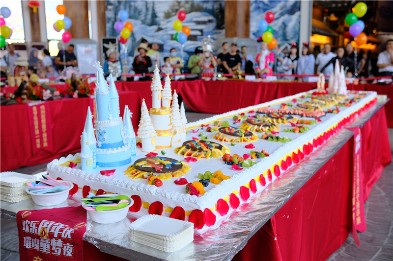 18日16時,美食狂歡節在石榴籽園2號廳盛大開啟。新鮮出爐的烤全羊、香辣咸鮮的小龍蝦等特色美食刺激著游客們的味蕾,讓他們盡享舌尖上的盛宴。用五彩糖果、多種水果和奶油打造的mini樂園版巨型生日蛋糕一亮相,就迅速抓住了小朋友們的眼球。游客們切蛋糕、唱生日歌,共同為童夢樂園送上祝福。現場洋溢著溫馨和喜慶的氛圍。